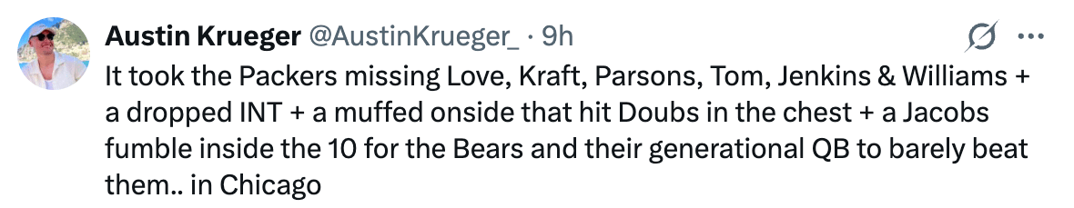 Look away Packers fans, we’ve seen this before. Anyone around for the 2014 NFC Championship where Green Bay fumbled the onside kick and proceeds to give up a deep, game winning touchdown had to relive the pain. Chicago benefited from a CVS receipt of improbable things to go their way to pull off the win and they got a couple clutch field goals in heavy winds from Cairo Santos. The “Cardiac Bears” continue to live up to the nickname, winning another game in the final minutes and if nothing else, this team continues to prove their new culture under Johnson is a for real recipe for success. On the flip side, despite another mostly strong outing from Malik Willis filling in for Love, the Packers cannot catch a break with injuries while still hunting to secure a playoff bid with two weeks left. Unfortunately for the Packers, the Rashan Gary extension is a complete bust and trusting Keisean Nixon to be their top cornerback remains a downfall of the defensive roster construction.