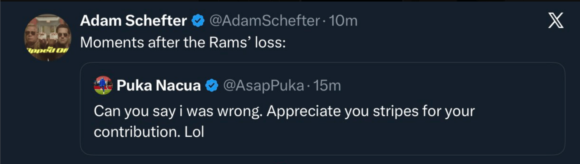 After trailing by 16 points in the fourth quarter, Seattle stunned the Rams 38–37 in an instant classic that featured Puka Nacua’s 225-yard receiving day and ended with Eric Saubert’s historic catch for the game winning two pointer. The win clinches Seattle a playoff berth and fans were just happy to see Kenneth Walker come alive again with 164 all-purpose yards. This Seahawks defense continues to prove to be as legit as it gets after facing a gauntlet of rushing attacks the past three weeks and not allowing a single 12+ yard run to the Colts, Falcons, or Rams. They’ve now defeated three 10-win teams (Texans, Jaguars, Rams) and there should be no debate they are the favorites to come out of the NFC at this point, regardless of how many ghosts Sam Darnold might see when he’s under pressure. As for Puka, this guy is unbelievable and the dominant play remains as marvelous as his tweet calling out the refs before the ink was dry on the game.