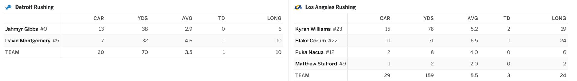 Puka goes nuclear in Rams win over Detroit: Nacua strings together a second straight game with 160+ receiving yards, going for 181 on nine catches in the 41-34 victory. Goff tossed a clean game for the Lions with 3 TDs and 0 INTs but it was a tale of two polar opposite rushing attacks. Lions fans reiterate league wide frustrations over officiating while Rams lose Adams to a hamstring injury.